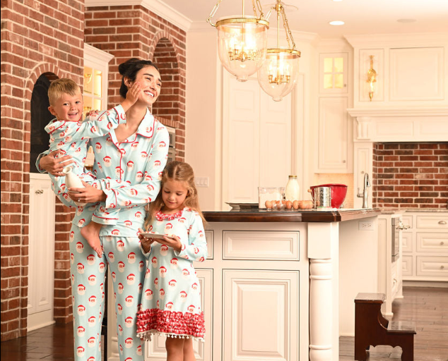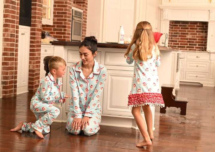She can’t wait for Santa to come. Capture that excitement with our matching girls nightgown and bloomers set. These feature the classic Santa face with a snowy white beard on aqua with white stars with red gingham accents. We’ve even got a matching doll gown. Pair with our matching buttflap PJs or our button down pajama sets for the sweetest brother sister photos or get everyone in the family matching Christmas jammies.