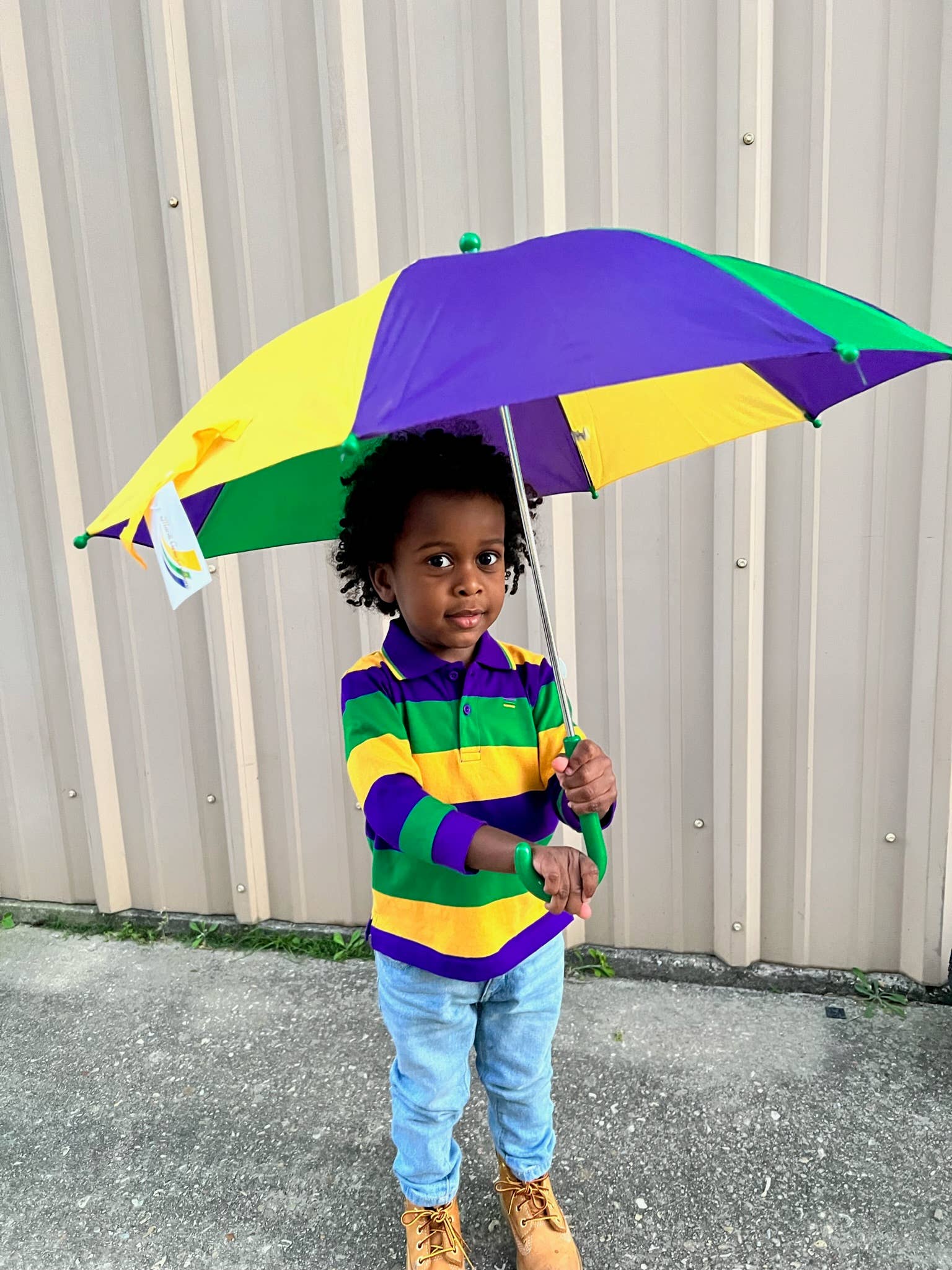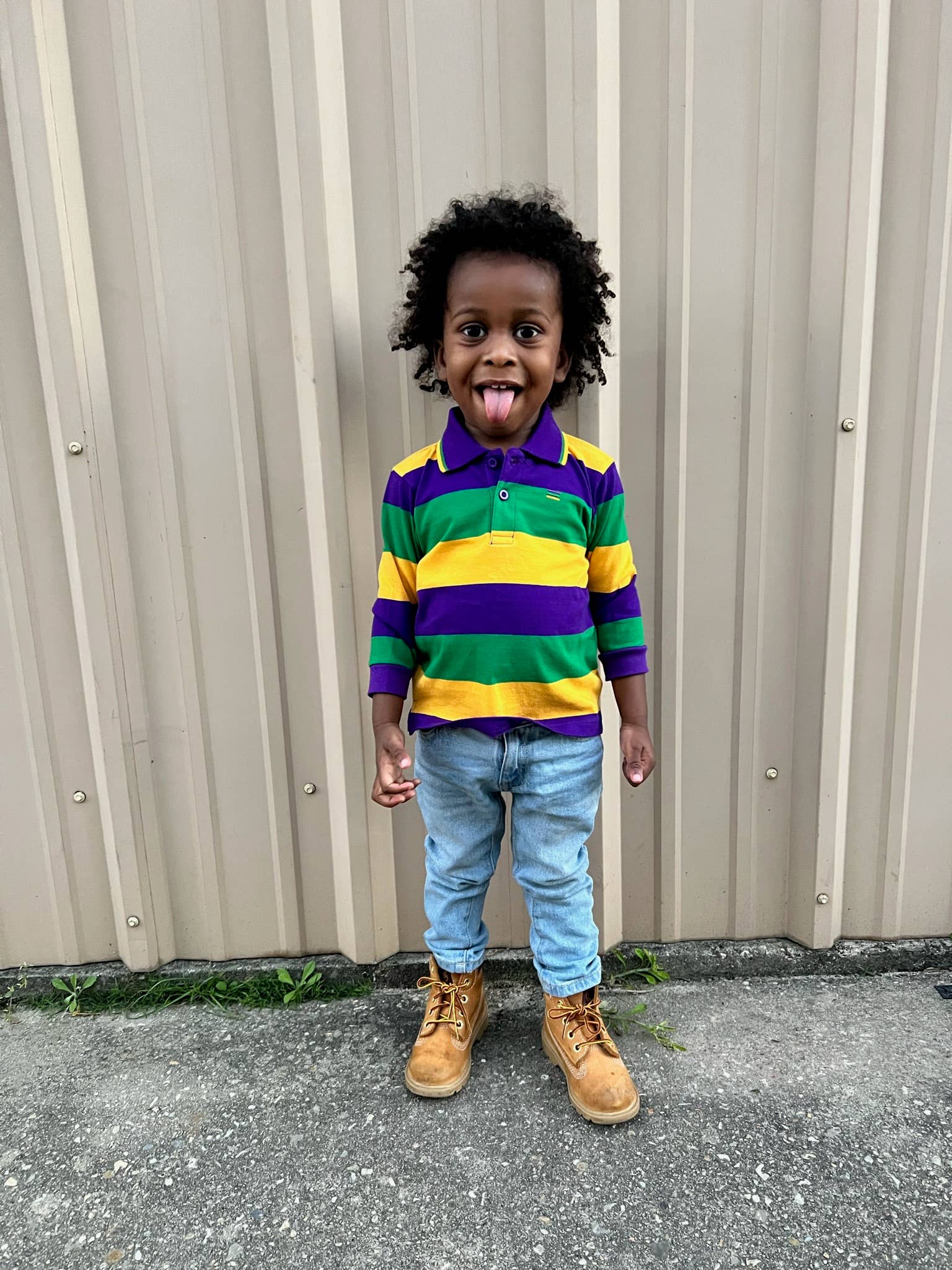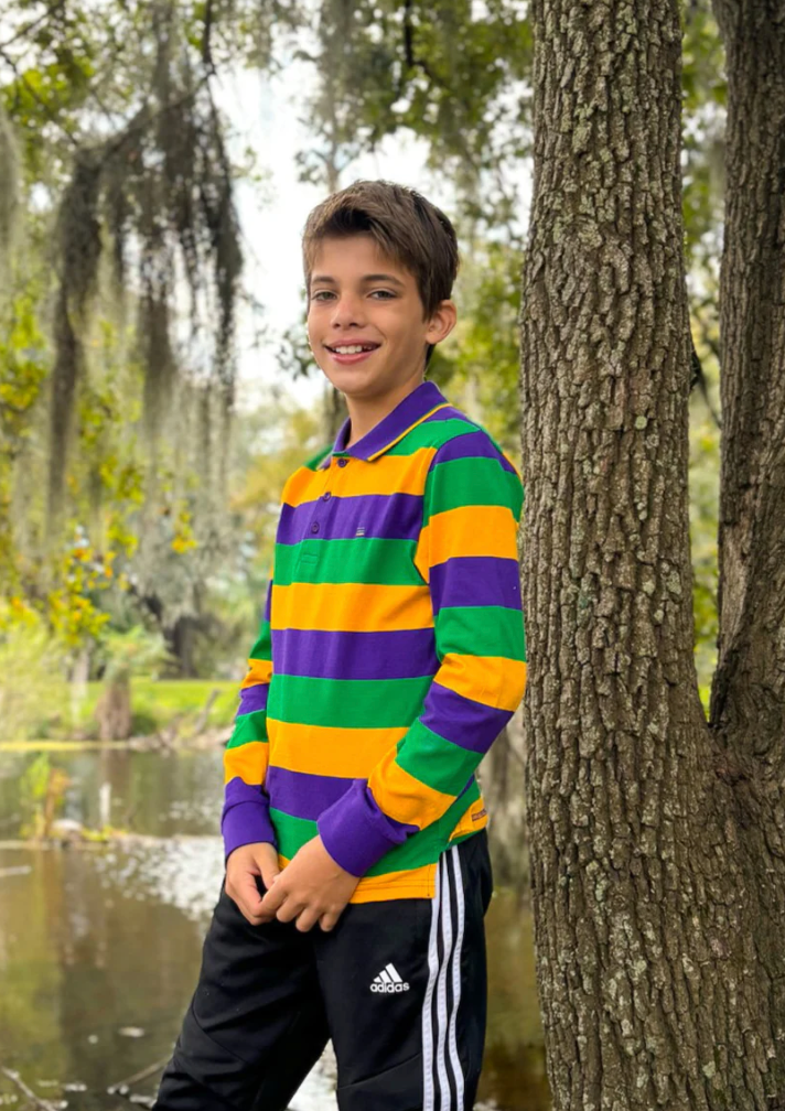 Celebrate Mardi Gras with this stylish kids rugby long sleeved with purple, green and gold small infinity stripe shirt. This shirt features purple, green and gold solid stripes.