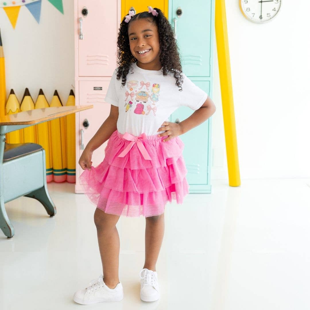 The Coquette School Doodle Short Sleeve T-Shirt is a fun and cute t-shirt for kids celebrating back to school!