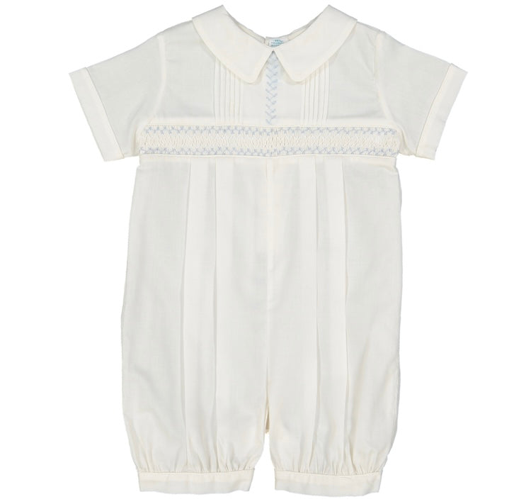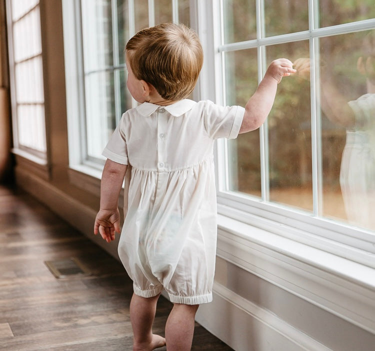 Moms have loved and trusted our unique vintage look for over 100 years. That's why our new Vintage Collection stays true to our timeless, heirloom style and quality. This beautiful, smocked romper is made with intricate hand-made details: tiny hand-stitched pintucks, elegant hand embroidery, and fluted French lace trimming the collar. Grab this beautiful baby boy romper - and if you have a princess who needs to match your prince, check out our girl dresses too!