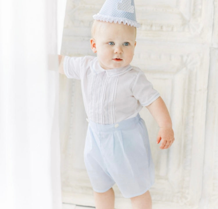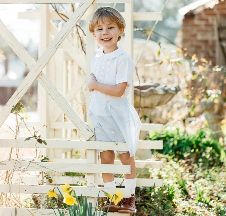 A timeless outfit for your little boy! This vintage style Bobby Suit is classy as can be, with its dainty pintucks, hand-stitched embroidery, and pleated pants. Fall in love with a beautiful heirloom piece that can stay in your family for years to come!