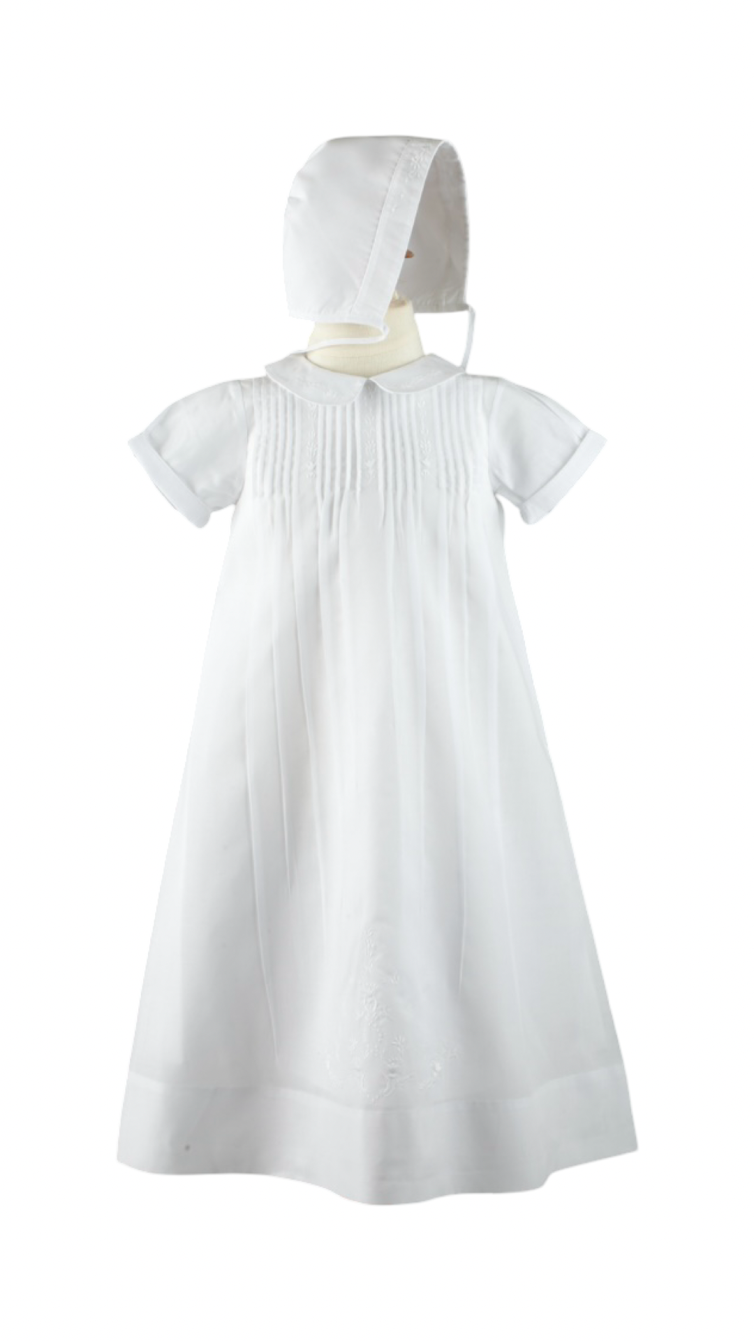 A beautiful special occasion set for your baby boy, a classic of understated elegance! This special occasion gown features breathtaking floral embroidery on the collar, bodice and hem - hand made of course, true to the Feltman Brothers legacy of heirloom quality and vintage style. Sharp pintucks at the top go into pleats down the length of the gown for a formal, classy look. Includes a solid white slip with scalloped edges and a hat with matching embroidery. In this one of a kind special occasion set, your loved one will look like the prince he is on his big day!