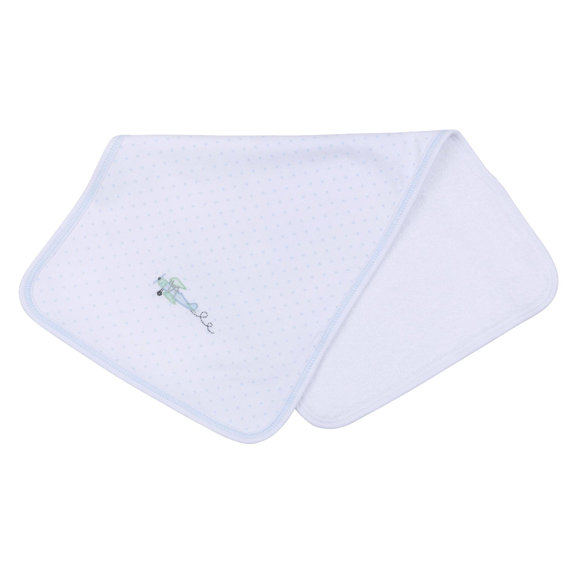 Magnolia Baby Take Flight Embroidered Burp Cloth This ultra-soft burp cloth is a daily necessity for quick clean-ups and adds a delicate touch to your shoulder. Made from our luxurious Pima Cotton, it features the subtle minidots print, a practical size, and fine **airplane embroidery** finished with a picot trim. Features: * 100% Pima Cotton: This exceptionally soft and gentle fabric provides ultimate comfort and is highly absorbent. * Embroidered Detail: Features a delicate **airplane embroidery** for a sweet, bespoke touch. * Subtle Minidots Fabric: A light, textured fabric adds classic visual interest to the design. * Functionality: Designed to be absorbent and perfectly sized for placing over the shoulder for quick clean-ups. * Picot Trim: Finished with a dainty picot trim along the edges for an heirloom touch. Benefits: * Easy Care: Made to withstand countless washes and adventures while retaining its beautiful texture. * Mix and Match: Coordinates beautifully with other pieces from the