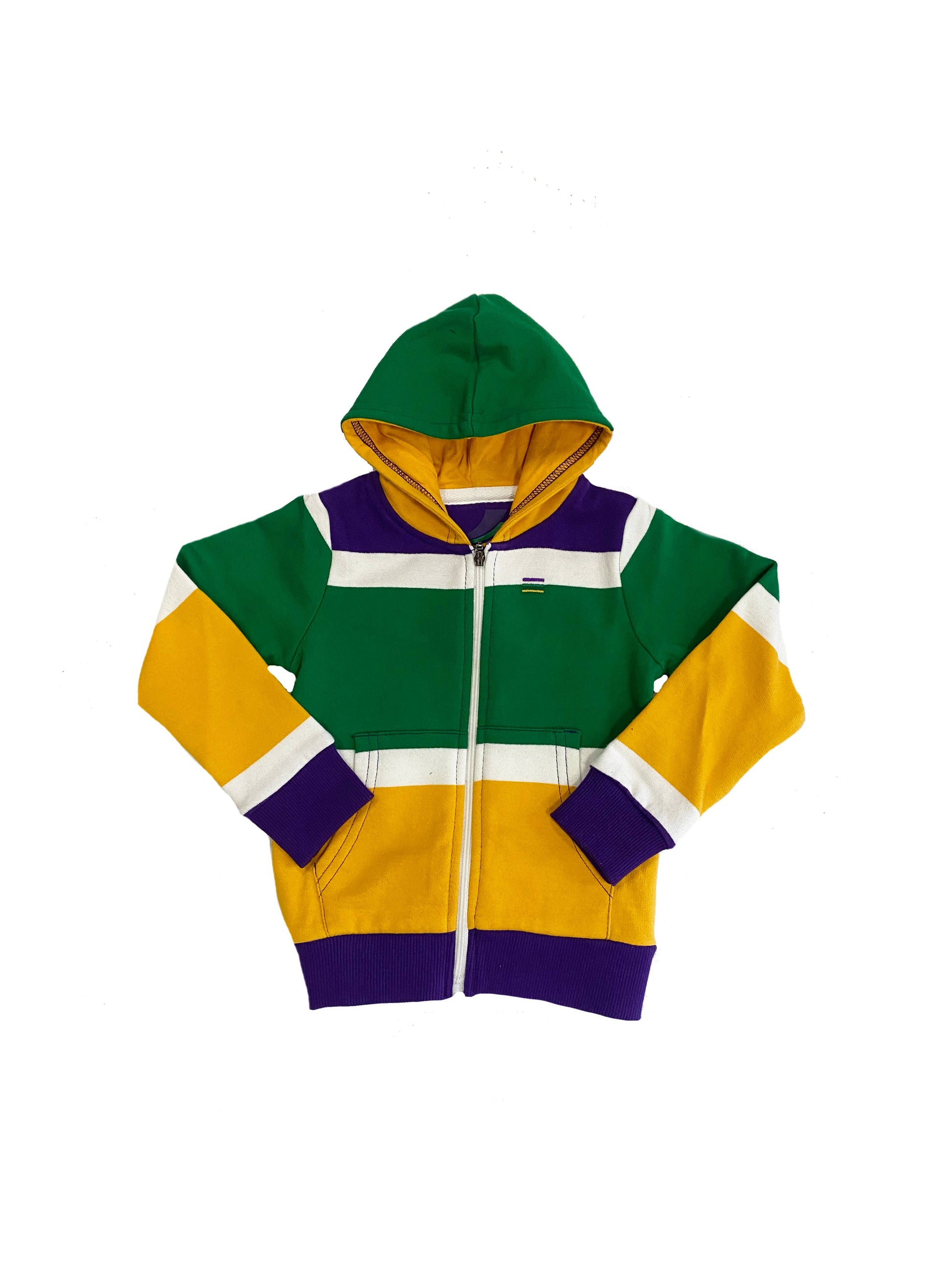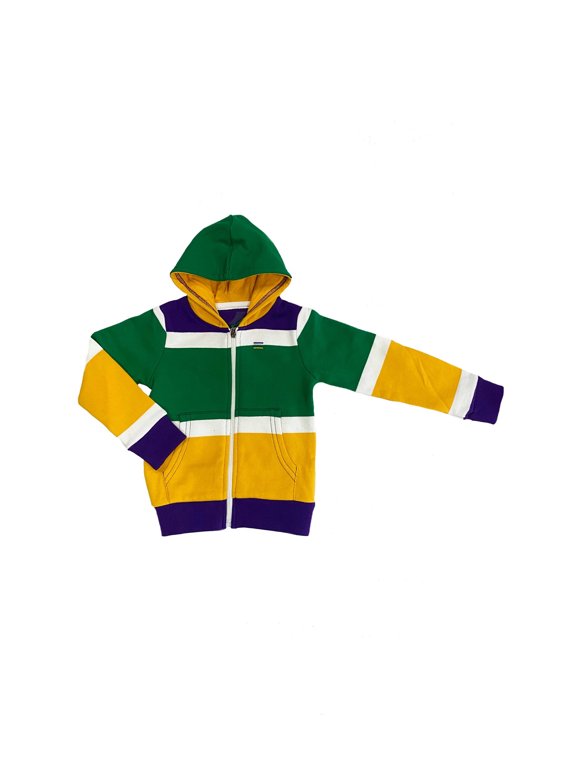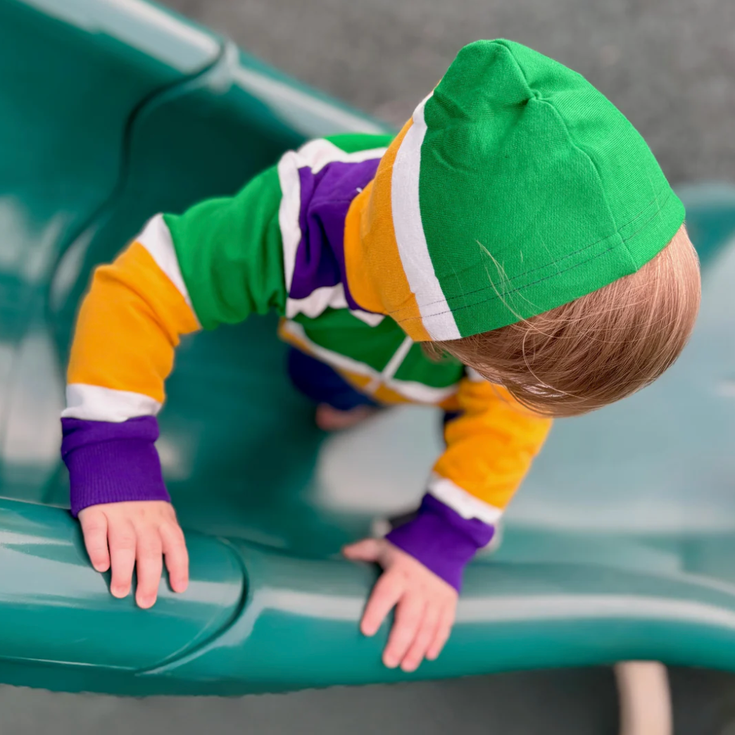 Gather 'round, because this Thick Stripe Rugby Infant Zip Up Hoodie is fit for a festive celebration! Perfect for a little one to keep up with the krewe, the purple green and gold stripes are like having a Mardi Gras parade right on your back! Now that's something to cheer about!