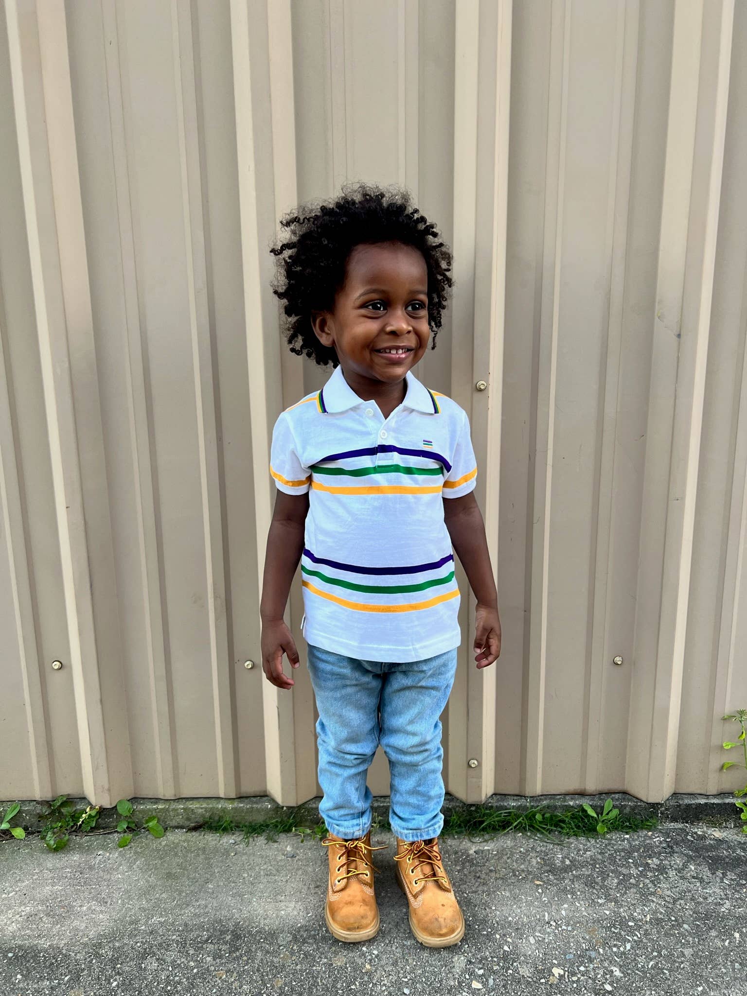 Celebrate Mardi Gras with this stylish kids white short sleeved with purple, green and gold small infinity stripe shirt. This shirt features thin purple, green and gold solid stripes. Small lines of purple, green and gold are around the edge of the collar.